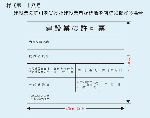 建設業者は、その店舗及び建設工事(発注者から直接請け負つたものに限る。)の現場ごとに公衆の見やすい場所に、国土交通省令の定めるところにより、許可を受けた別表第一の下欄の区分による建設業の名称、一般建設業又は特定建設業の別その他国土交通省令で定める事項を記載した標識を掲げなければならない。