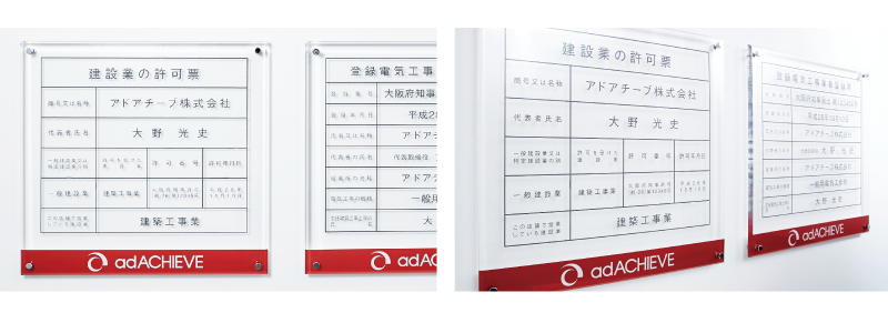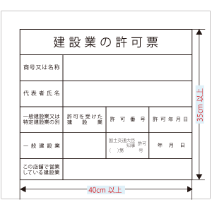 また、法令に基づいたサイズ及び項目内容でお作りいたしますので、 お客様にも信頼感の得られる建設業の許可票を掲示いただけます。